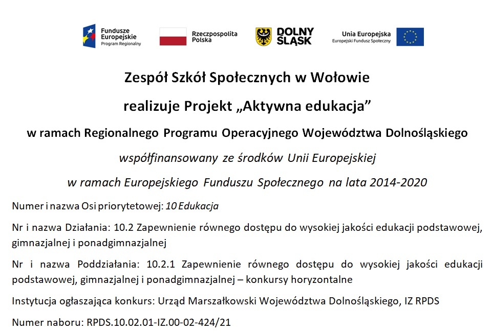 Miło nam poinformować że nasz szkoła została beneficjentem projektu w ramach Regionalnego Programu Operacyjnego Województwa Dolnośląskiego, współfinansowanego ze środków Unii Europejskiej w ramach Europejskiego Funduszu Społecznego.
