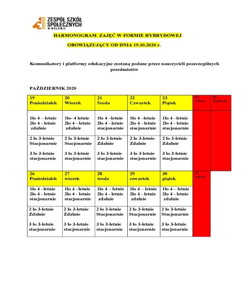 uczniowie klas 4 - 8 szkoły podstawowej oraz uczniowie liceum ogólnokształcącego od dnia 26.10.br. do dnia 08.11.br. będą uczyli się wyłącznie za pomocą technik i metod kształcenia na odległość, według dotychczasowego planu zajęć,