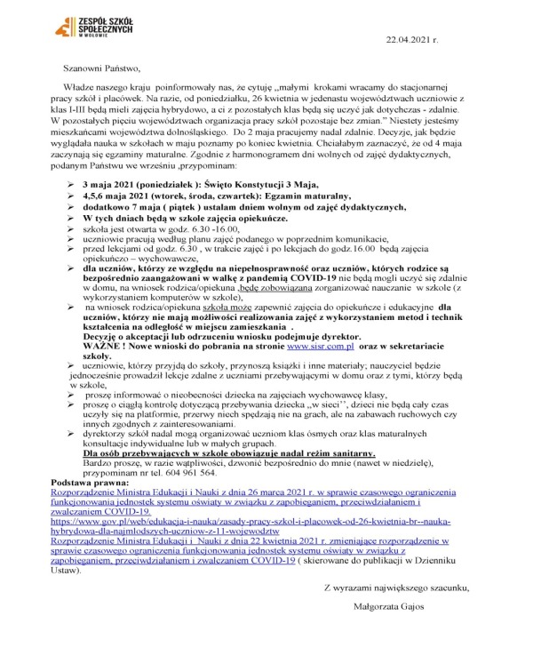 Szanowni Państwo: Rodzice, Nauczyciele, Pracownicy Szkoły, Uczniowie,